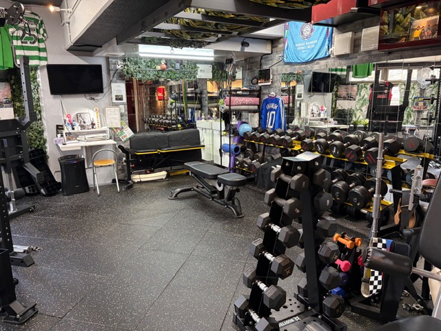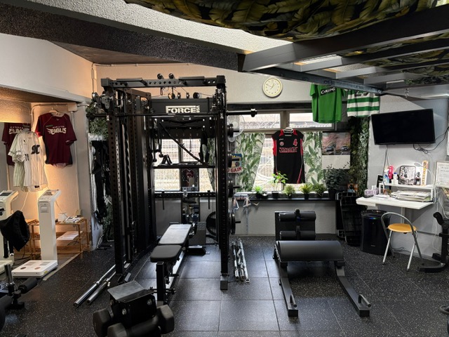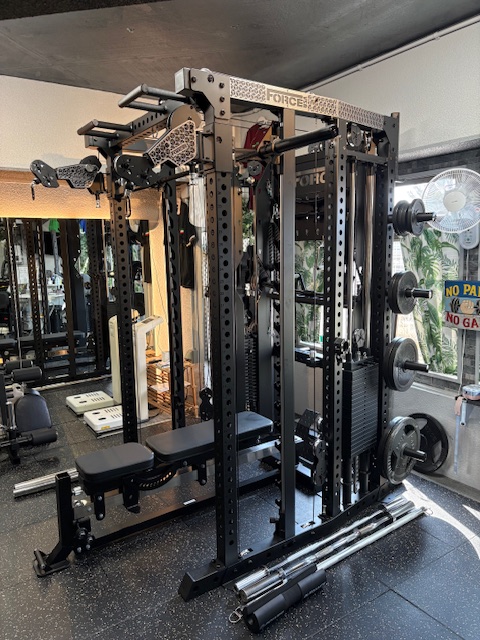 個室ジムでもレッグプレス・ハックプレスで脚系のトレーニングやTバーロウもできる Force USA 社の最高機種C20 マルチラックを導入していて、その他にプレス/プルマシン、グルート/ヒップレイズマシンと軽量から高重量(34kg)までの固定ダンベルとエアロバイクも揃えているので、初心者から上級者まで満足させる様々な筋トレが可能です。